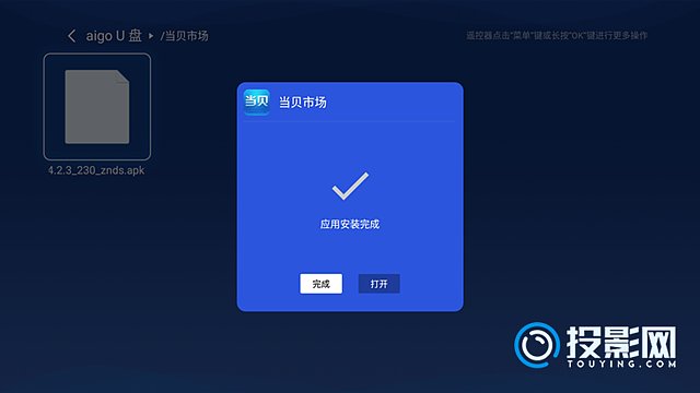 演示机型信息: 品牌型号:极米h3 系统版本:GMUI3.6 软件版本:当贝4.2.6 从电脑上下载当贝市场,把安装包的后缀名改为apk1;||将安装包拷贝进U盘后,接入投影仪usb接口;||在极米h3投影仪上打开u盘,找到当贝市场apk文件并安装。