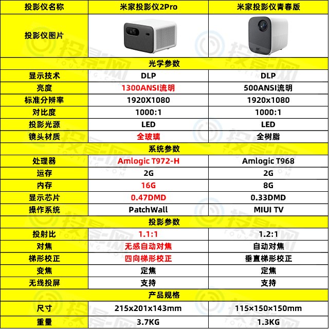 5.显示芯片:米家投影仪2pro采用0.47DMD显示芯片,青春版采用的是0.33DMD;