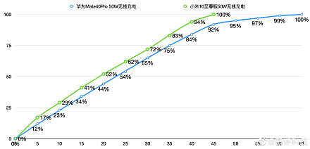 华为50W无线充电实测,从关机状态到充满需要61分钟,小米是44分钟。
