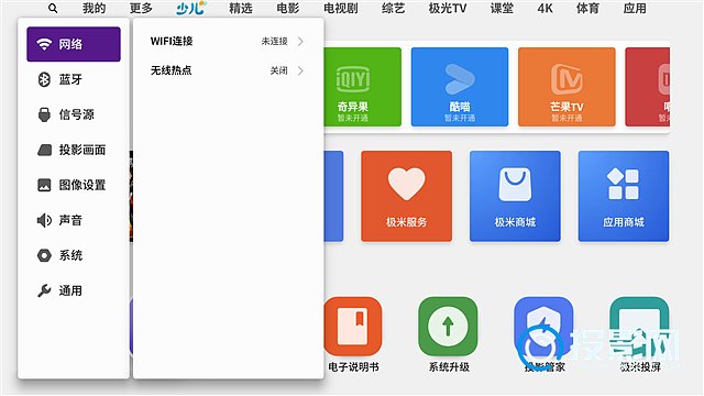 5、INUI换新:NEW Z6X升级为全新INUI,此前已经介绍过极米新系统INUI的使用方法,主要的更新在于,单拎出了影视、氛围、音乐、K歌等功能,同时系统设置等功能设计成了更简洁明了的样式。