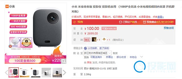 5.米家投影仪青春版:预付定金100元可抵扣500元,实际支付2299元即可入手,还可获赠一年保修和米家夜灯2,同时将保价30天。