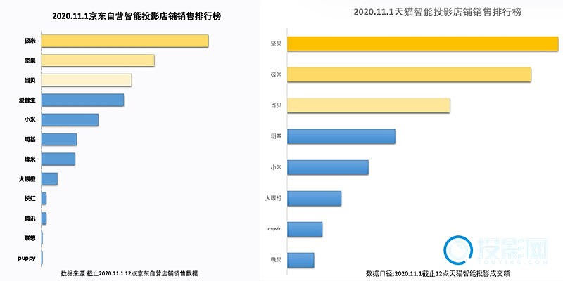 2020年11月1日天猫智能投影店铺销售排行榜前三分别为坚果、极米、当贝。京东智能投影店铺销售排行榜前三分别为极米、坚果、当贝。天猫平台上,坚果智能投影反超极米,拿下第一;京东平台仍然是极米投影领先;而当贝投影以短短不到两年的时间,跻身全平台销售排行榜前三,连续两年拿下投影仪品牌销量增速第一