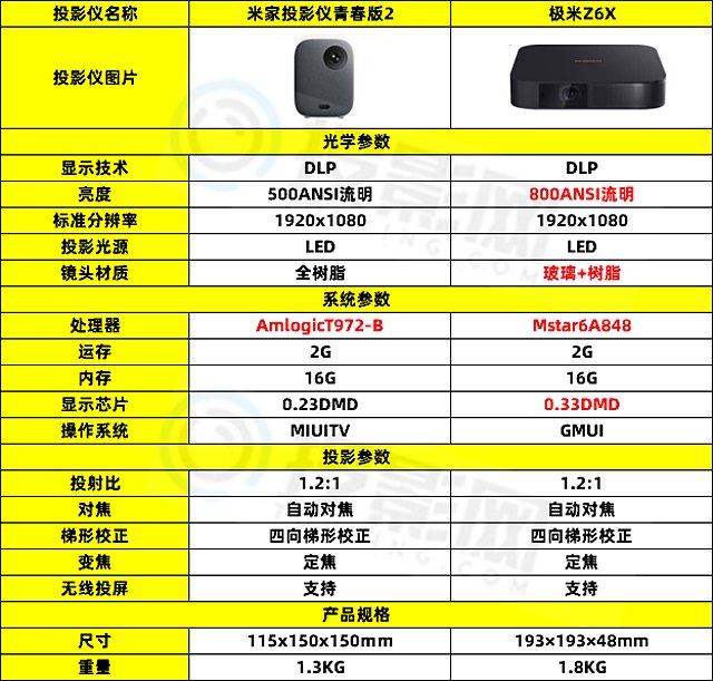 一、米家投影仪青春版2和极米z6x的参数对比表