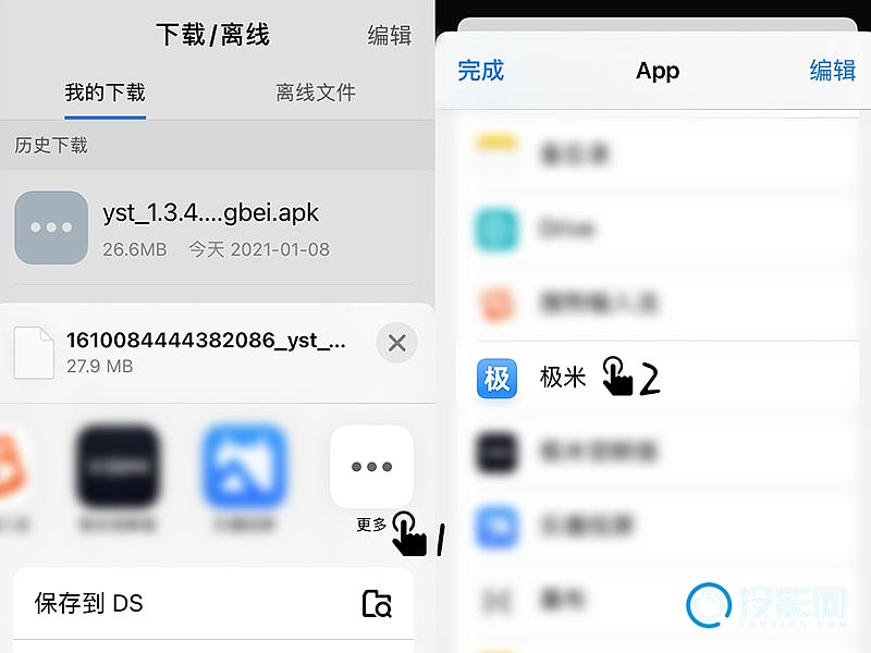 1.首先还是需要通过手机浏览器下载好安装包,点击安装包名称,在弹出的菜单中选择【极米】。