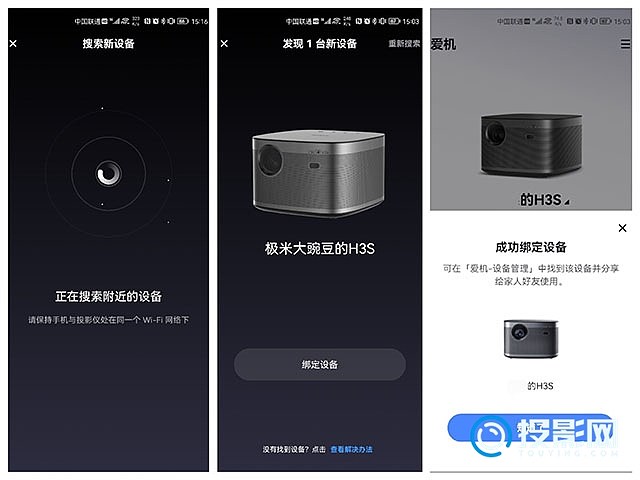 2.进入【添加设备】后画面如下图1所示,等待搜索一般等待5-20秒左右,搜索到设备后就会如下图2所示,再点击【绑定设备】。接着界面会提示您填写验证码,将投影画面显示的验证码正确输入,绑定成功后APP画面显示如下图3所示。