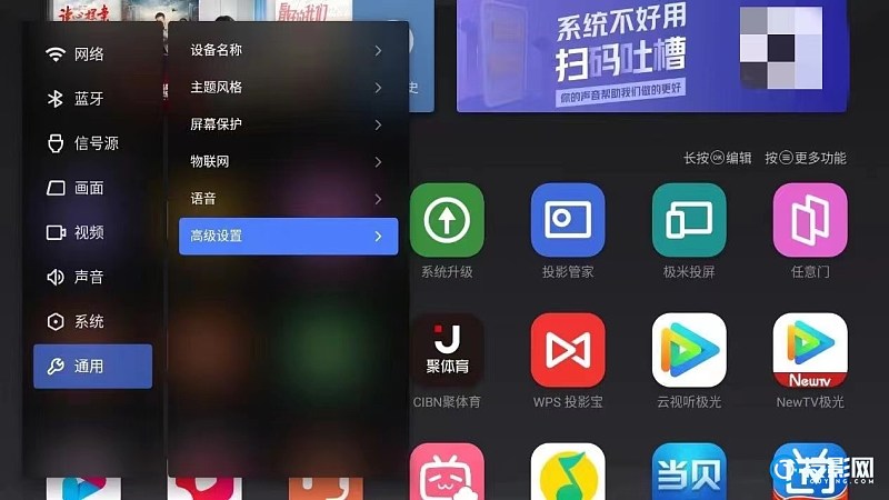 首先我们打开投影仪,在【系统设置】的界面中选择【通用】设置,之后打开【高级设置】,在下面的选择栏我们会看到【上电自动开机】的开关,将开关打开显示绿色即可完成开启这项功能。