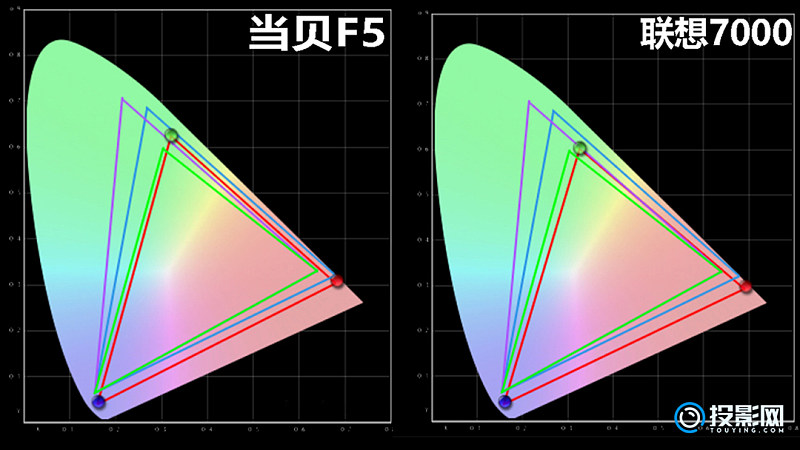 另外,我们针对两款投影仪使用校色仪进行了色域测试,得出结果为当贝F5的色域为95%sRGB,联想YOGA7000的色域为92%sRGB,色域范围也是当贝F5更广。当然我们测试的数据可能和官方数据不同,这与测试环境、测试方法以及测试仪器有关,但联想YOGA7000和当贝F5都是通过同一测试设备在同一环境下测试的结果。