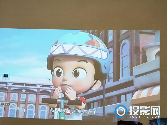 3.白天拉上窗帘看效果一级棒非常好,现在是最好的哄娃神器哈,等着买个地拉幕布,投影到花壁布上效果也会很好。画面很清晰,放在卧室里面投在墙上特别爽,相信会比期待的效果更好,操作跟电视那样简单。