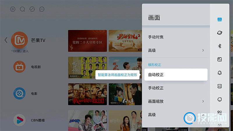 (1)点击【设置】→【画面】,进入【梯形校正】选项下的【手动校正】。