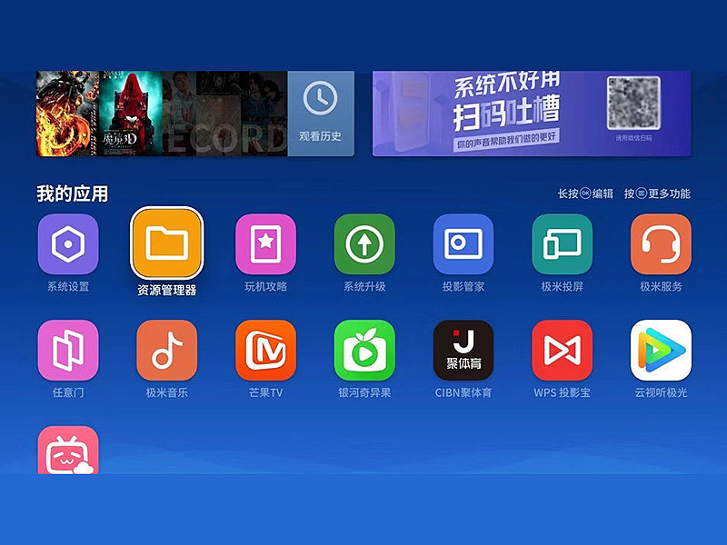 在极米H5中点击我的应用,选择资源管理器,打开投影仪存储空间;