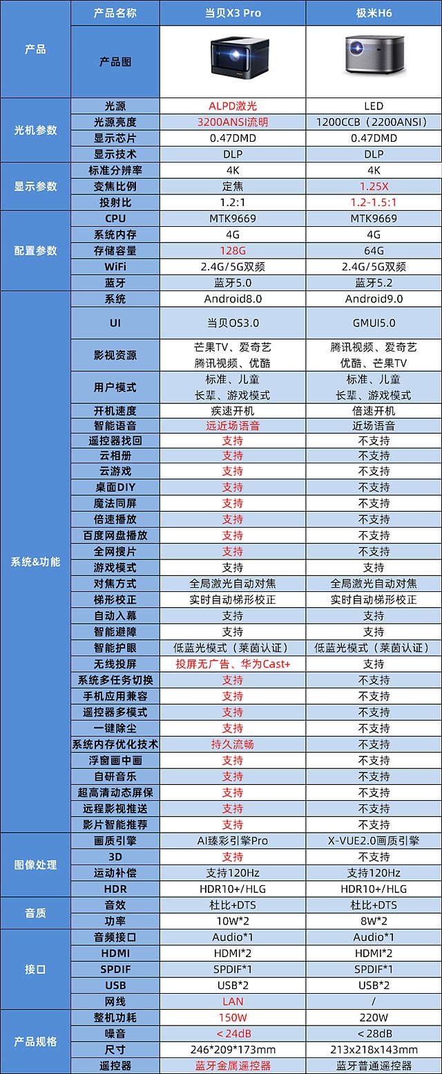极米H6在光源上还在使用十年前的LED技术,有点落后了,而且亮度还没提升,相比前代H5还退步了。对光源和亮度比较在意的话,推荐一下当贝X3激光投影仪。当贝X3使用的是高端影院ALPD激光技术,我们常见的电影院IMAX厅也都是采用激光电影放映机,屏幕更大、色彩要求更高的电影放映机正是激光投影技术大显身手的舞台。所以说激光投影现在已经变成未来投影行业发展的趋势。