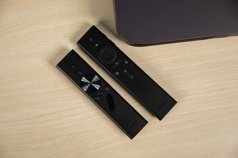 遥控器方面,当贝D5X Pro采用金属拼色遥控器,带有当贝独家的魔法侧边键,手感细腻,极米Z7X则是塑料材质,且没有侧边键功能,在使用上有些麻烦。