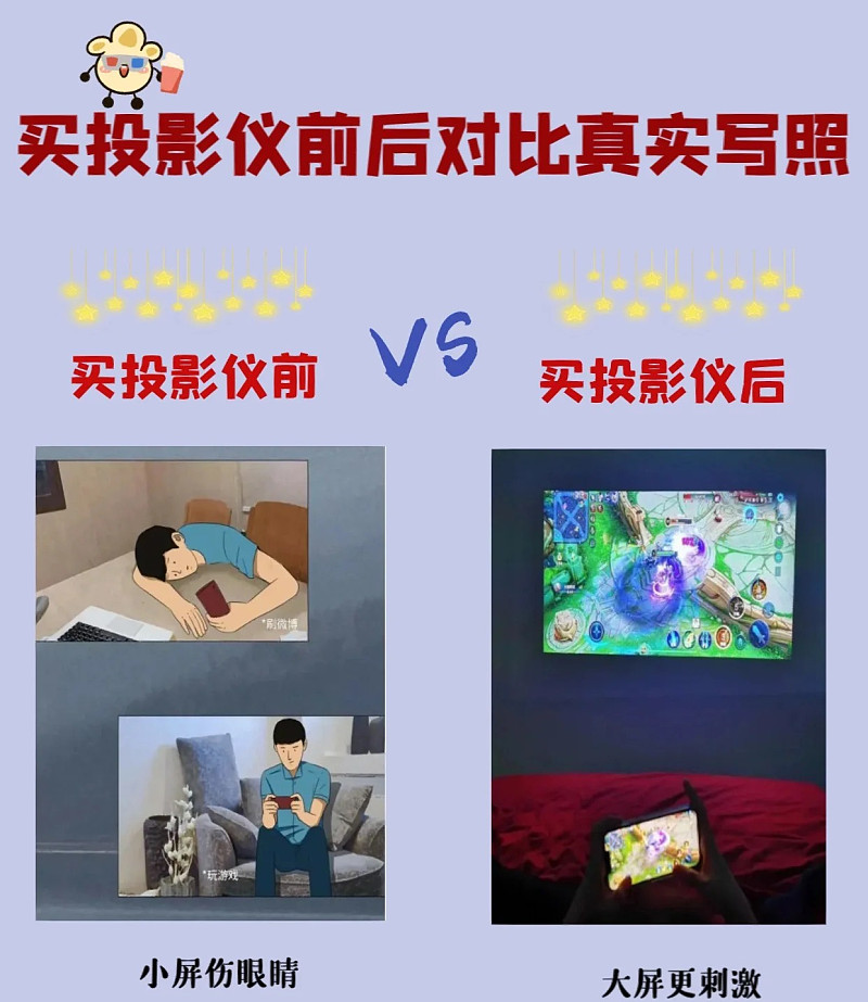 买投影仪前只能拿着手机小屏幕看电视追偶,或者打游戏,偶尔不注意还会直接掉下来砸到自己的脸,买投影仪后,就不用担心手机砸脸问题,直接大屏观看,实现追剧自由,大屏幕追剧打游戏更加爽歪歪。