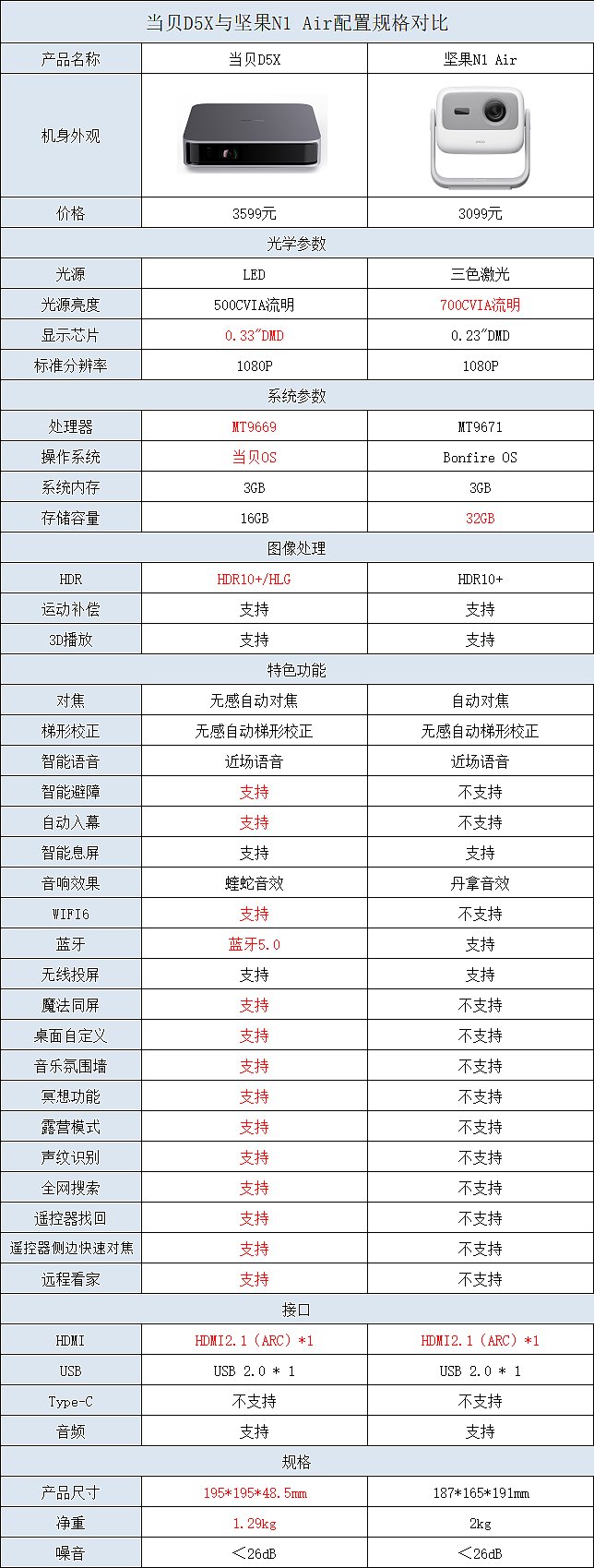 当贝D5X如果亮度在高点就好了,不过性能、功能和清晰度确实给力,坚果N1Air配置缩水的厉害,而且一个云台让设备也没那么便携,还是厚度不到5cm的当贝D5X更值得入手