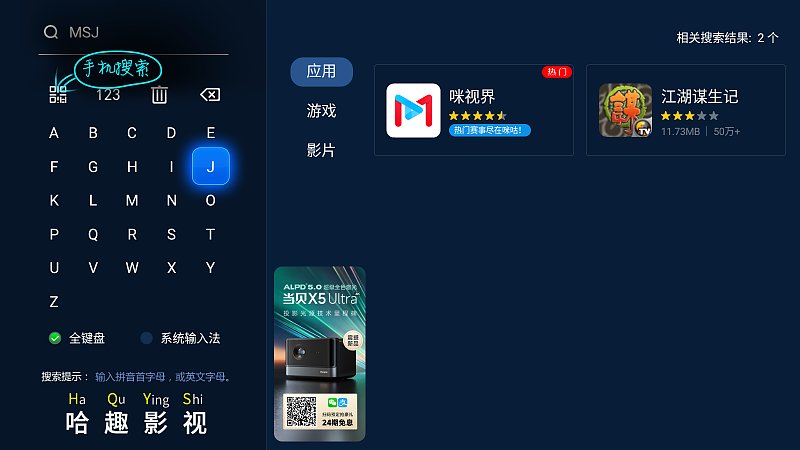 1.在电视自带应用商店或当贝市场搜索“MSJ”,下载安装咪视界大屏软件;