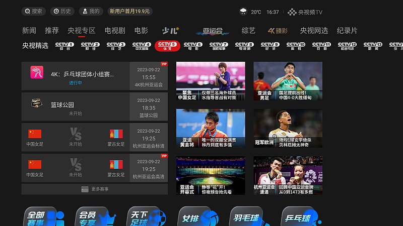 2.打开后在首页最上方的导航栏中找到“央视专区”,选择“CCTV-5”观看直播或选择“亚运会”专区观看。
