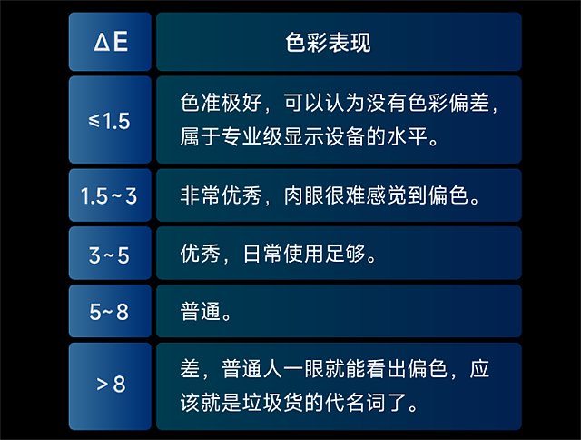 色域决定了显示器能显示多少种色彩,而色准则决定色彩是否准确。色准的单位是△E(DELTA-E),△E的数值越小越好,如果 △E 过大,就会出现颜色失真、偏色等现象。大家在选购显示产品时,可以参考下面这个行业通用的标准。