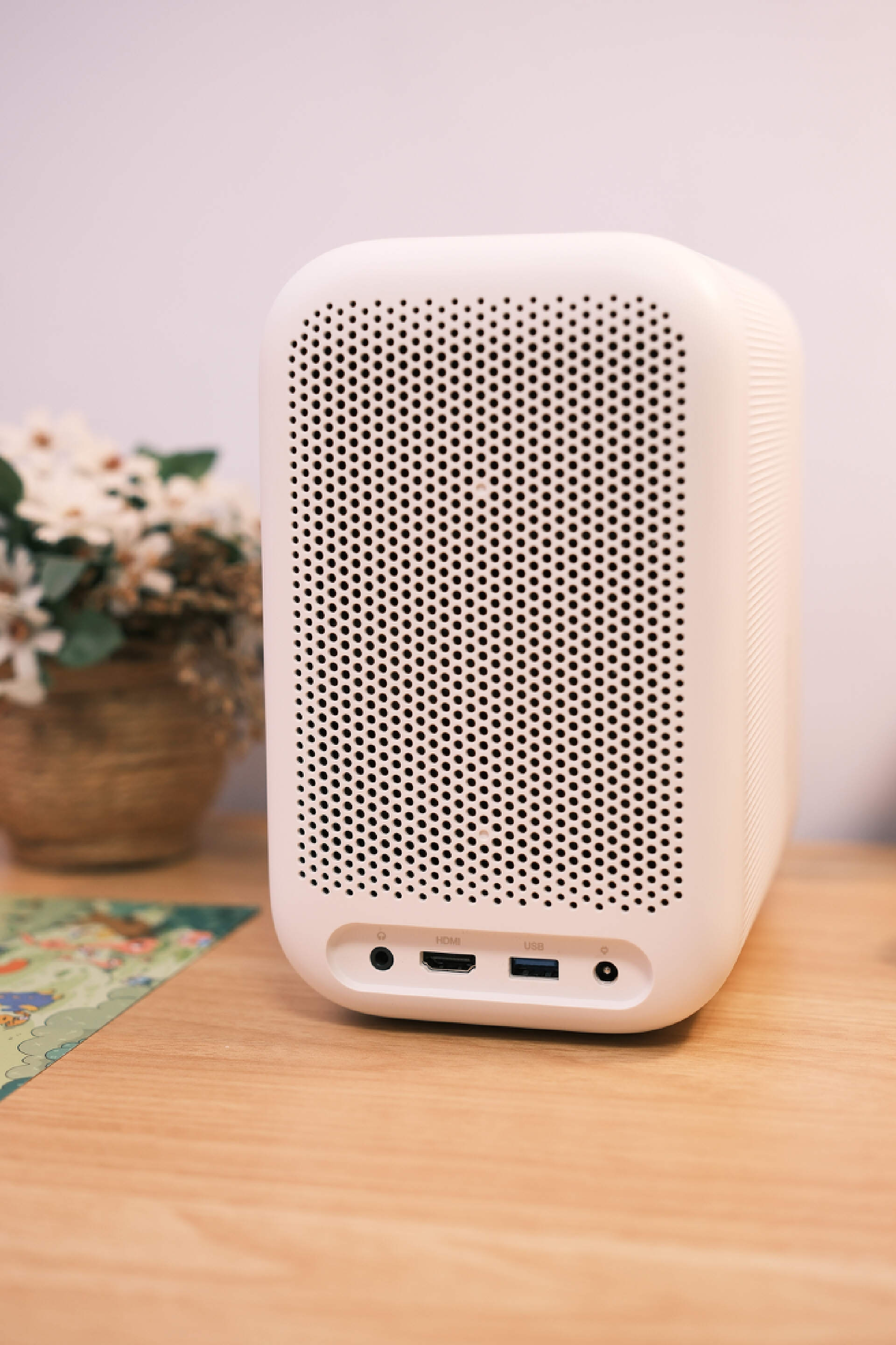 先说价格,1699元,然后外观一体白色机身,放在家里桌上、书架上,或者吊装,白色真的是百搭,大气、优雅。