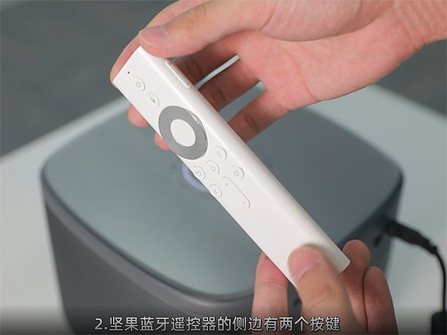 拿出坚果投影仪的遥控器,并在遥控器上找到对焦按键;