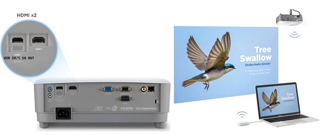 优派PA504W拥有USB供电及双路HDMI方便选配无线同屏方案:两路HDMI高清数字输入接口,配备USB供电接口,方便外接小型模块化设备,无需额外使用电源适配器;选配优派 PJ-WPD-700无线同屏器,即插即用,不用安装驱动/软件及连接网络,系统会自动搭建P2P点对点网络,支持长达30米距离的1080p全高清信号传输,实现完美的企业级无线影音传输方案。