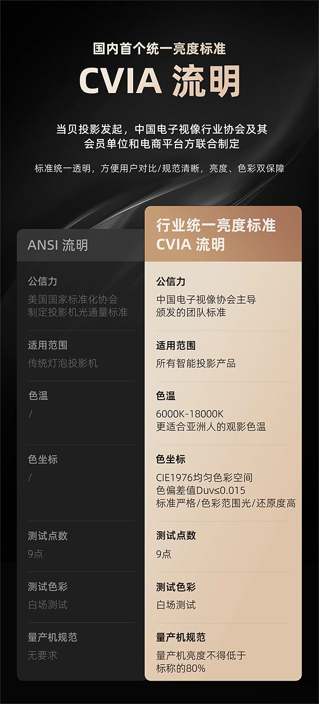 2023年,作为家用投影赛道的头部品牌,当贝联合中国电子视像协会和各大品牌共同发起发起“CVIA流明亮度标准”。在当贝全系投影产品正式启用最新“CVIA流明亮度标准”后,主流投影仪厂商纷纷将亮度单位更换为“CVIA流明”。需要注意的是,CVIA流明亮度单位的应用,不仅是对当时投影仪亮度乱象的权威干预,也是家用投影行业进入规范化阶段的重要标志。