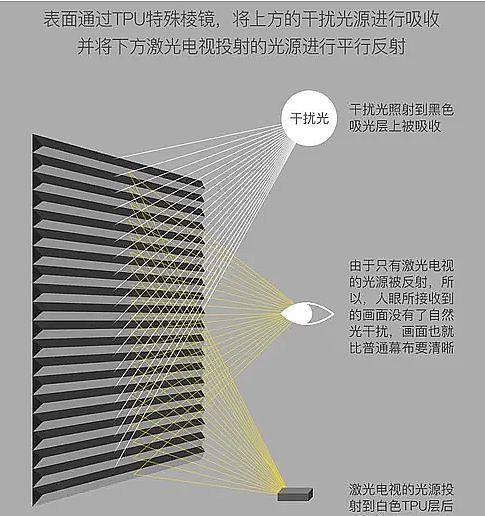 超短焦抗光幕布就是通过物理方式实现抗光效果,比较典型的就是黑栅幕布和菲涅尔幕布: