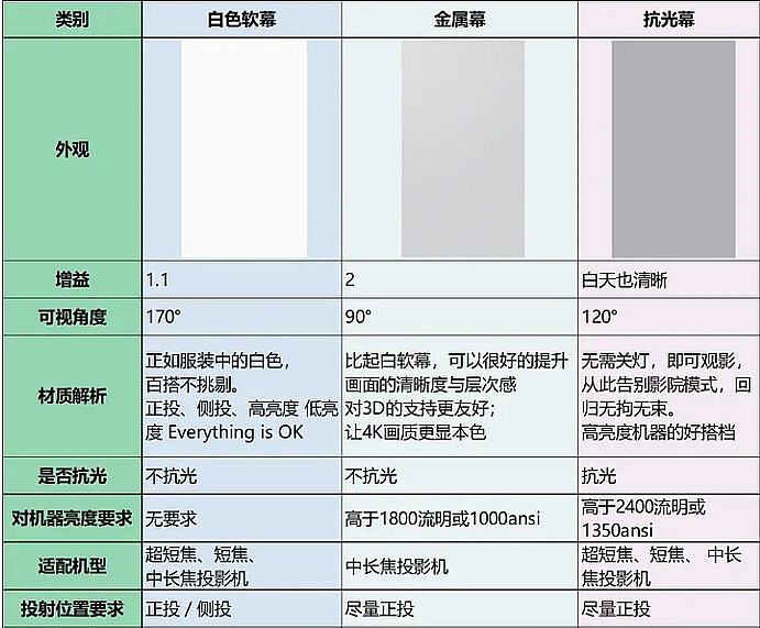 不同材质的幕布,抗光性和增益性都不相同,也会影响画面的可视角度。