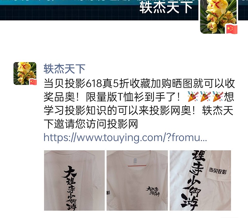 当贝投影618真5折收藏加购晒图赢好礼!奖品T恤收到!
