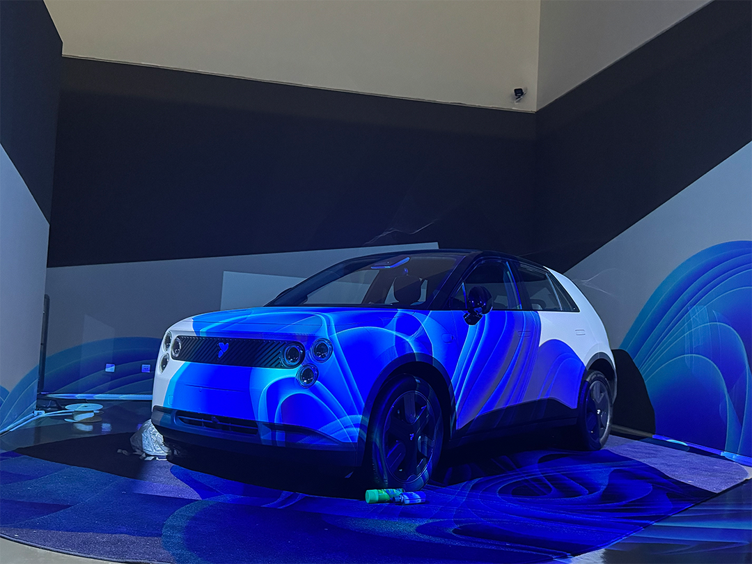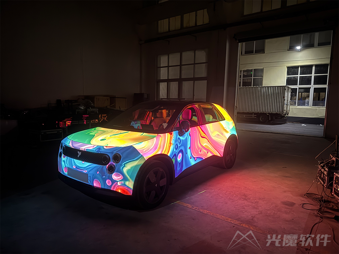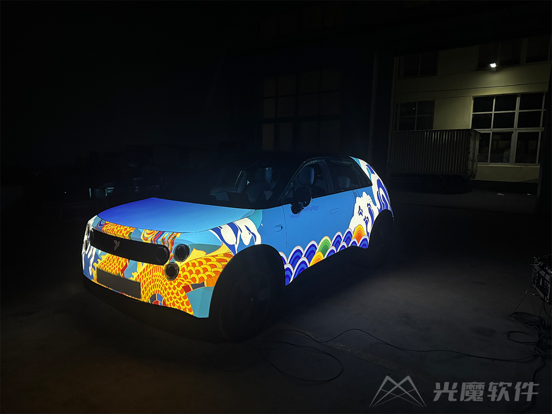 该项目位于上海美术馆艺术设计大展16号展厅,该展项使用了2台全高清高流明投影。该项目采用光魔自主研发的Immersive7.0融合播控软件,使用软件3DMapping模块,经调试完成车身精确对位,实现光影内容与车身形态的无缝匹配。同时提供桌面融合运行互动程序,手绘光影涂装实时上传,Dly各种风格的车衣。